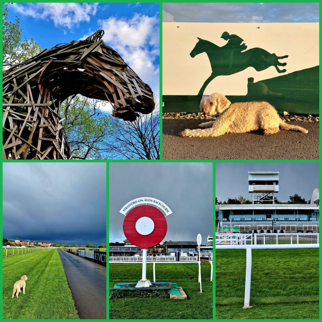 Nachdem der Campingplatz in Warwick überraschend schon ausgebucht war (im April!), hat Herrchen einen ulkigen Stellplatz gefunden, nämlich auf der Pferderennbahn von Stratford-Upon-Avon. Um es gleich vorweg zu nehmen: Pferde haben wir dort keine gesehen, naja fast keine…