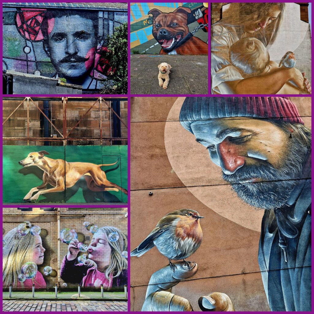 Eine Besonderheit von Glasgow sind riesige Wandgemälde. Auf einem ist übrigens der auch ansonsten überall präsente Stadtheilige Charles Rennie Macintosh verewigt. Und habt ihr den gemein aussehenden Hund gesehen? Warum eigentlich nicht ich, eine freundlich aussehende Chefredakteurin mit englischem Namen. Freie Wände gibt es hier noch.
