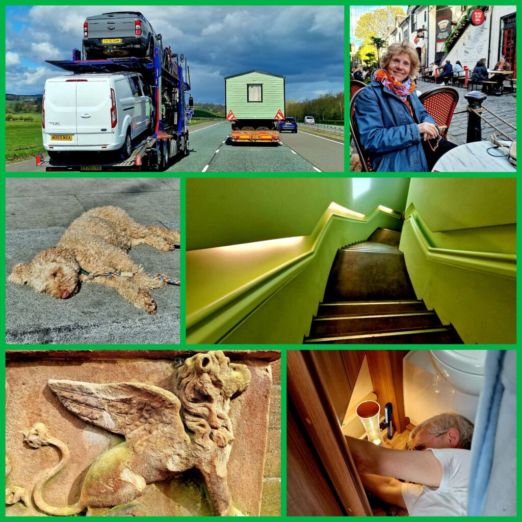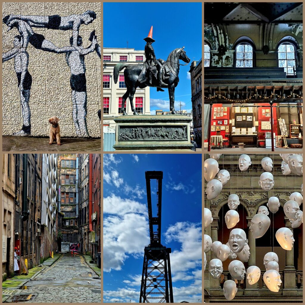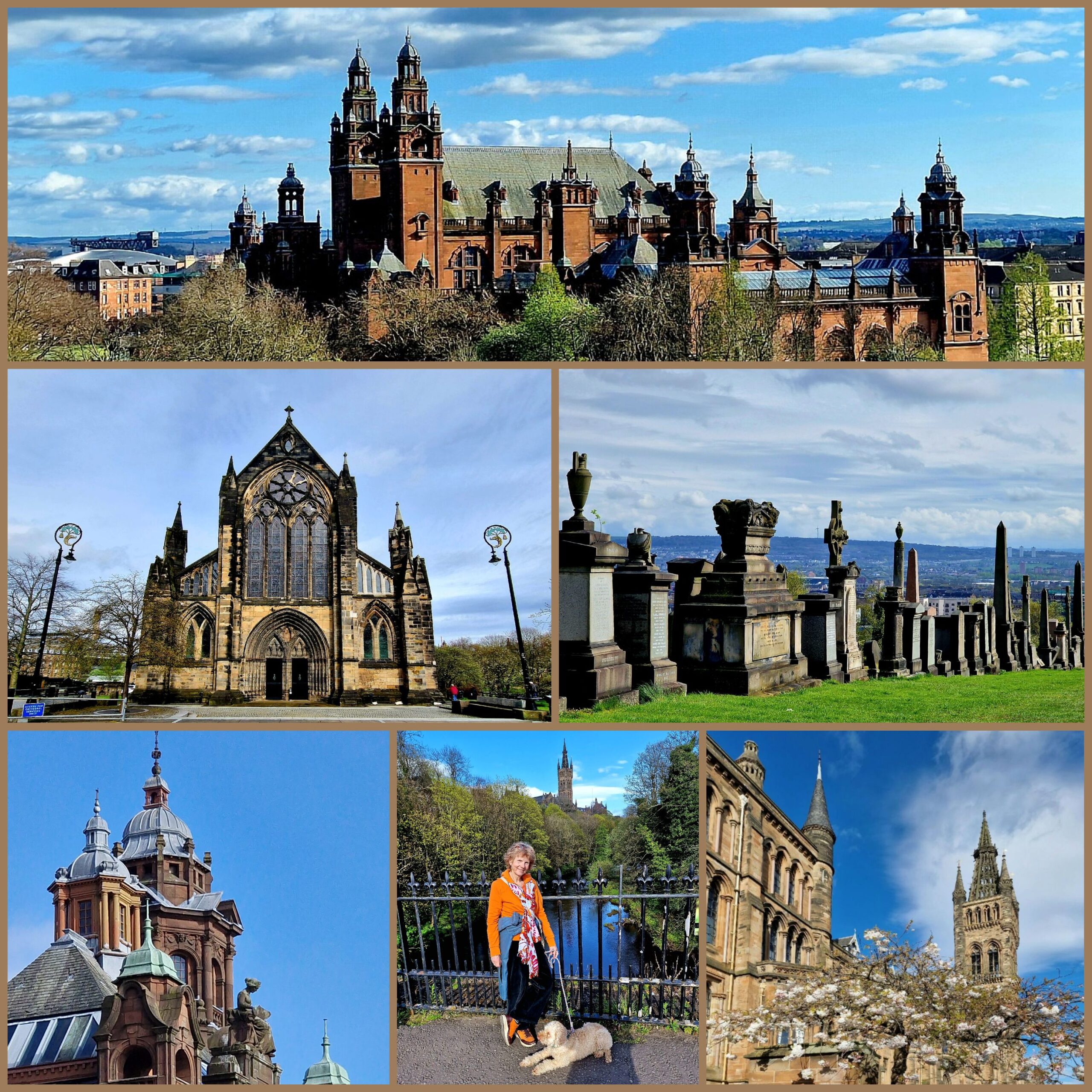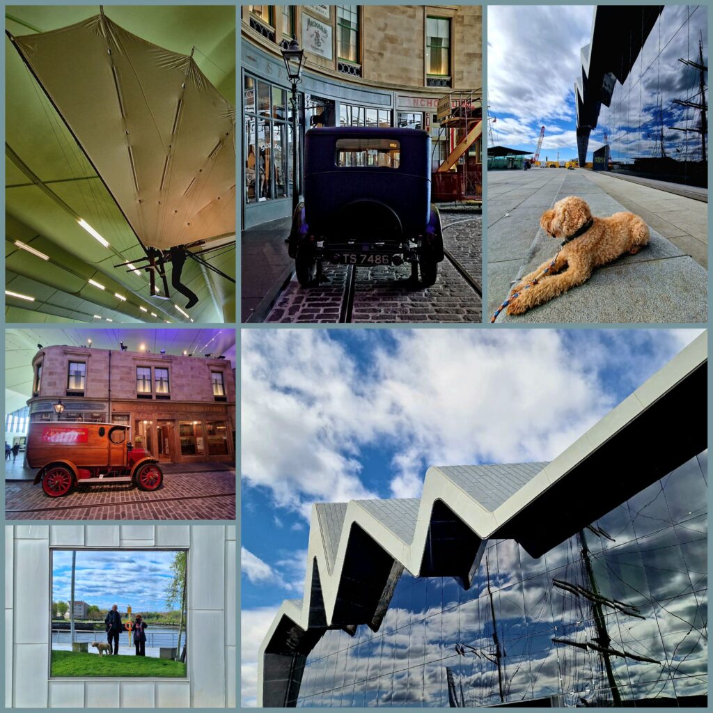 Hier zunächst die Auflösung der Collage vom letzten Mal: Alles strebt nach Glasgow, selbst dicke Autos und ganze Häuser; Frauchen sitzt in der Pub-Meile und wartet auf ihr erstes schottisches Bier; ich völlig platt vom Pflastertreten; Treppenhaus des Riverside-Museums von Zaha Hadid; ein Lagotto mit Flügeln (hätte ich manchmal auch ganz gerne); Herrchen (endlich mal bei der Arbeit!).