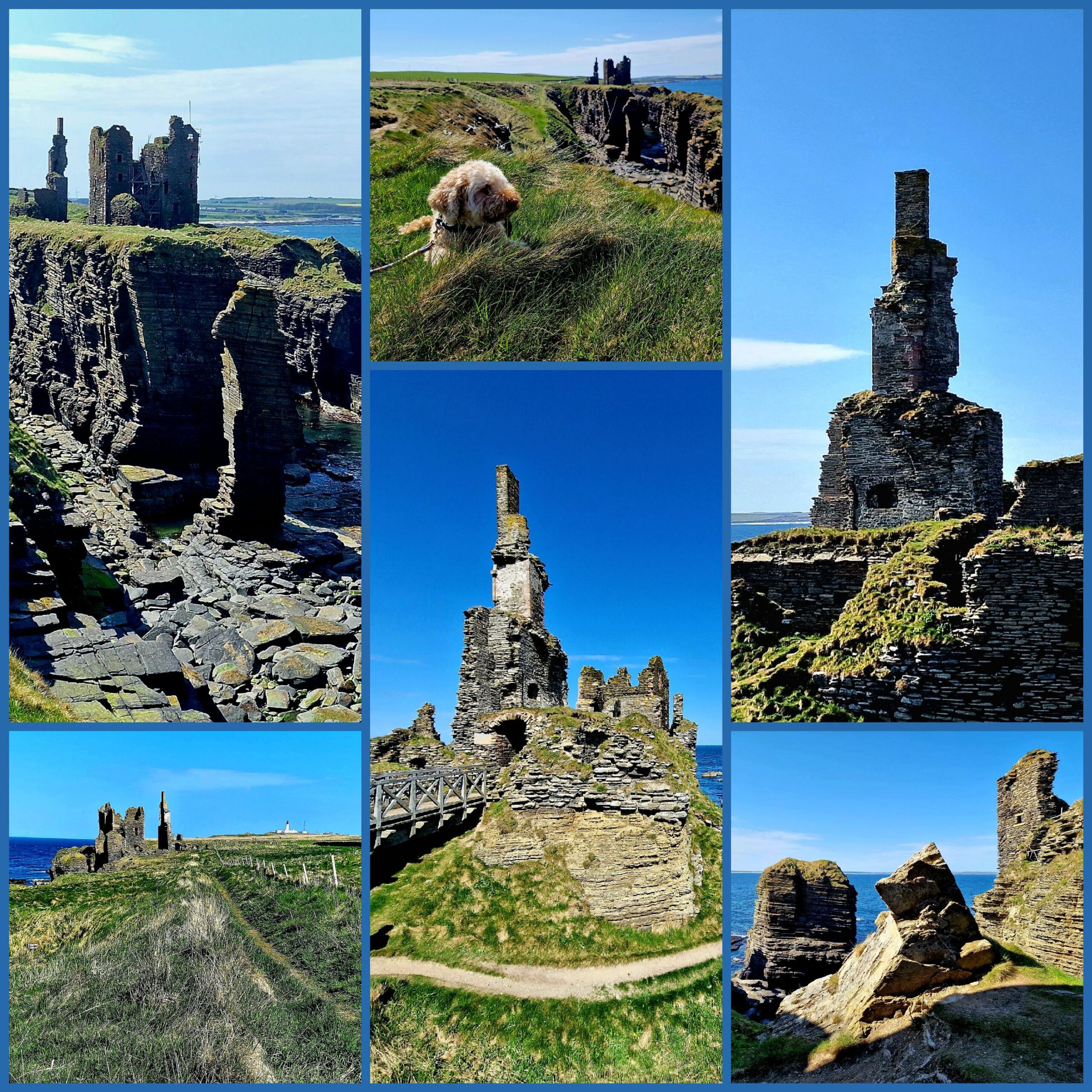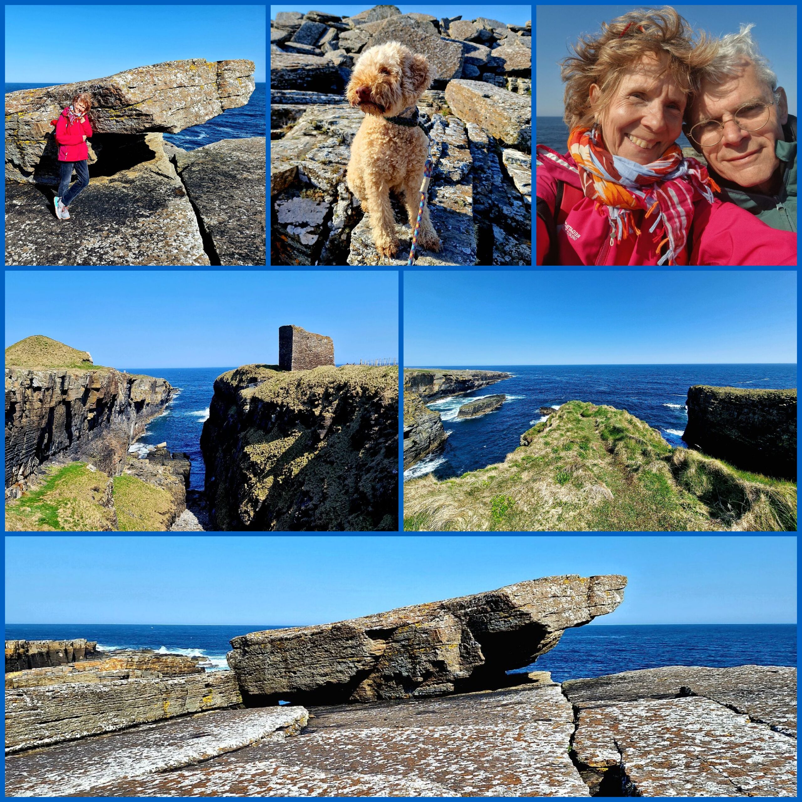 Version III (steht direkt auf einer Tafel vor der Burg und gefällt uns am besten): Der Earl of Caithness hatte sich beim luxuriösen Ausbau seiner Burg so sehr verschuldet, dass er pleite war. Vor seinen Gläubigern flüchtete er auf die Orkney-Inseln (da will Frauchen auch noch hin). Der Campbell beanspruchte die Burg. Zwischen Campbell und dem anderen Sinclair kam es zum Krieg, den der Campbell gewann. Die Burg stand leer, weil die Residenz inzwischen in Thurso (20 km weiter) war.