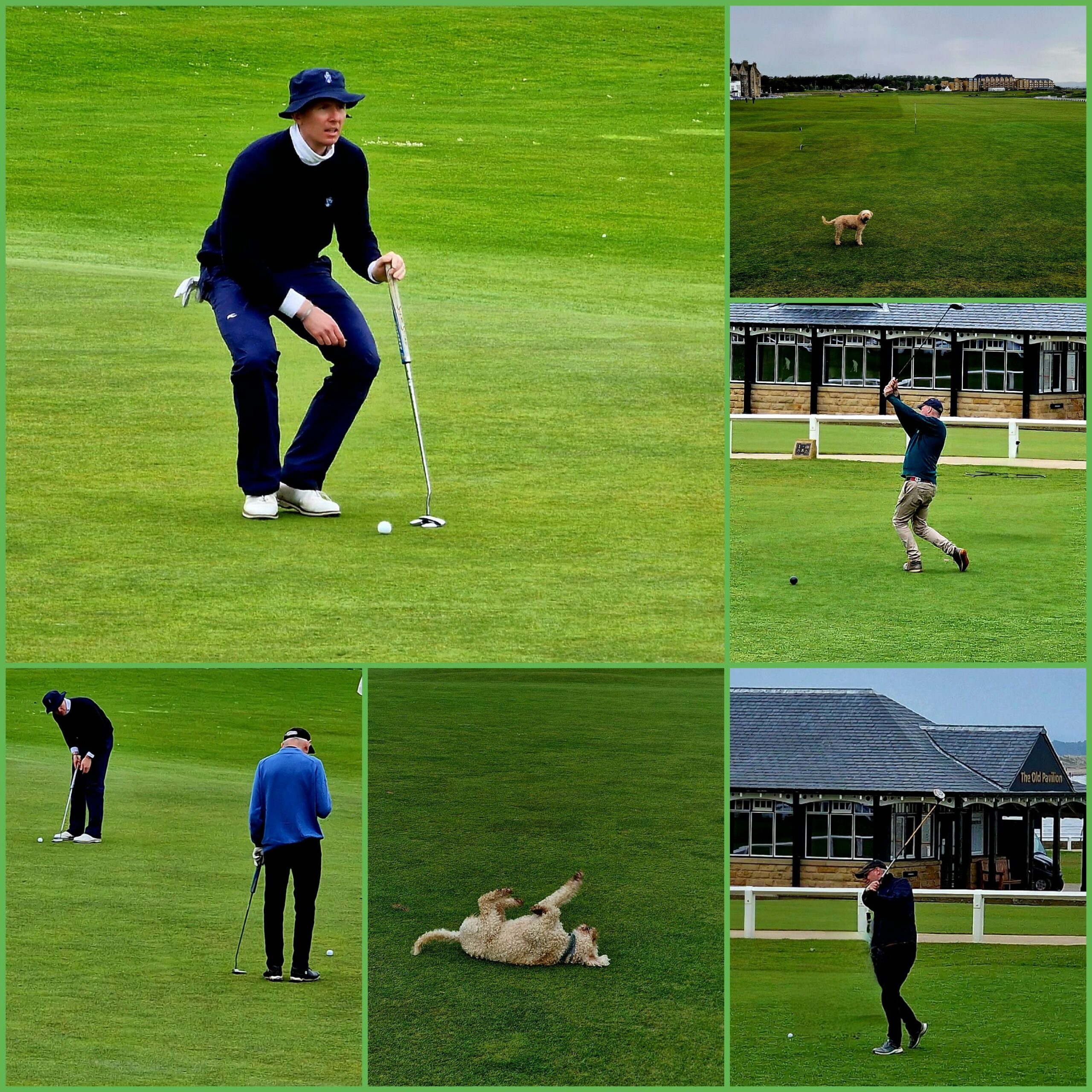 Am nächsten Tag war in St. Andrews alles anders. Der heilige Rasen wurde heute bespielt und ein Mitarbeiter des Royal and Ancient Golf Club regelte den Verkehr. Der Navi hatte uns auf die Straße mitten durch die Rasenfläche des Golfplatzes geführt. Wir wurden angehalten und mußten mindestens gute 5 Minuten warten, bis die Golfer auf der anderen Seite angelangt waren. Klar: Golfer haben hier absolute Vorfahrt! Wir haben dann den Golfern bei der Arbeit zugesehen und Bildredakteurin Frauchen hat es dokumentiert.