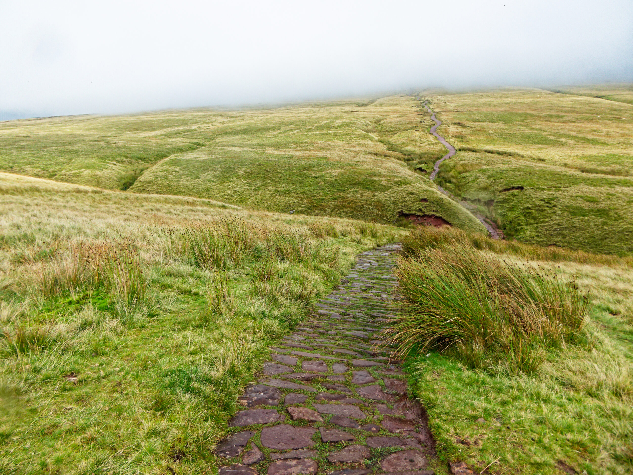 Es gibt mehrere Wege auf den Pen Y Fan und sie haben sicherheitshalber den gewählt, der etwas abfällig „The Motorway“, also „Die Autobahn“ heißt. Der ist gut gepflastert. Frauchen hatte Wanderschuhe. Herrchen hat keine Wanderschuhe, meinte aber, seine Straßenschuhe reichten. Ich hatte wie üblich meine Allwetterpfoten dabei.